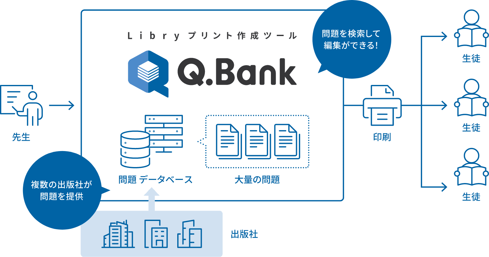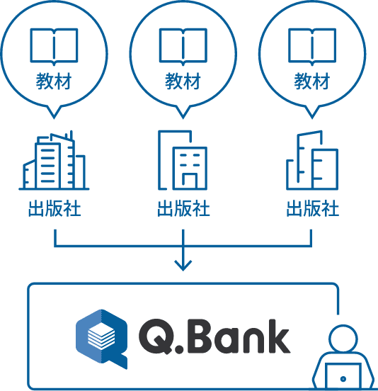 提携出版社各社が発行している教科書・問題集・参考書などに掲載されている問題を集約することによって,Q.Bankに巨大な問題データベースを形成します。その問題データベースから,出版社を横断して自由に問題を選んで編集することが可能です。