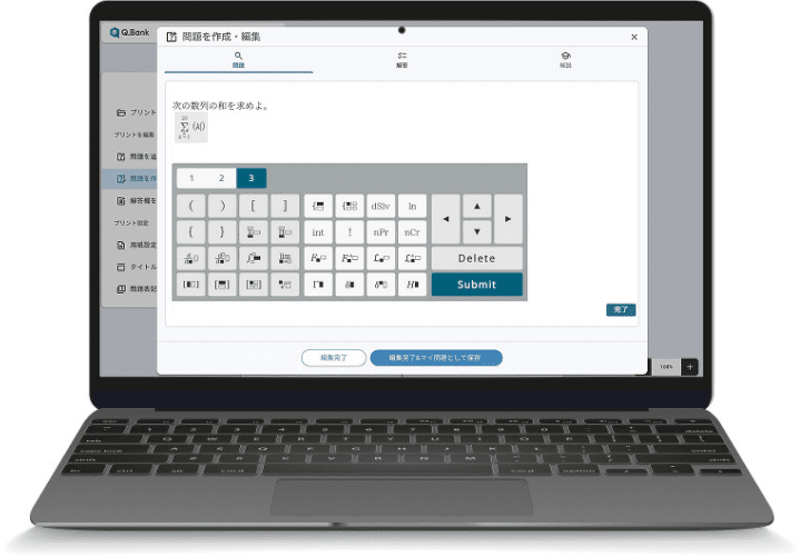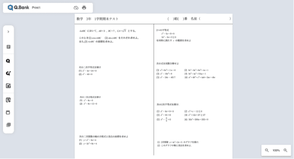 啓林館が発刊する教科書・教材に掲載されている問題のほか,Q.Bankと提携する出版社が発行する教科書・問題集・参考書などに掲載されている大量の問題をデータベースに収録します。問題数は9万問以上※(2025年9月時点での予定)。先生はそれらの問題を,出版社を横断して検索し,編集することが可能です。