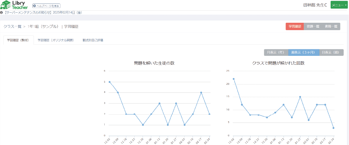 クラス全体の学習の取り組み状況をグラフで表示したり,個人の自主学習の取り組み状況を表示することも可能です。