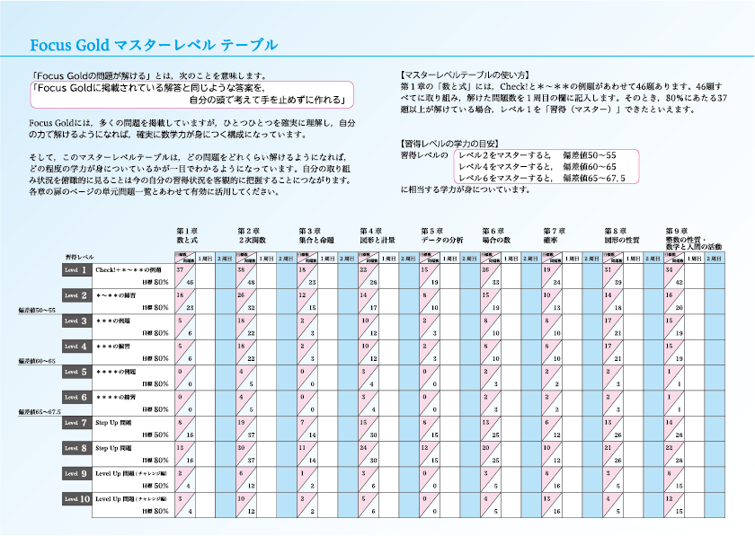 どの問題をマスターすれば,どれくらいの学力が身についているのかを指標として知ることができる「Focus Gold マスターテーブル」を掲載しました!