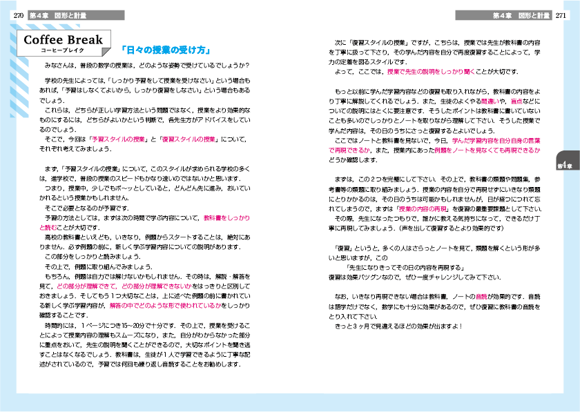 数学的な内容を掲載したコラムだけではなく,「日常学習の方法」「定期考査を終えて」「模試の活用方法」「解説動画をみるとき」など,普段の学習方法に関するコラムも豊富に掲載しています。