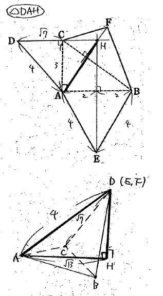 体積は辺や垂線の長さから求めるのが自然な発想であり,四面体の体積から垂線の長さを求める思考の流れに,技巧的な印象を強く受けた。そもそも,垂線の長さに注目するのみで,垂線そのものについて深く考察できていない点に,思考の中途半端さを感じる。垂線の足の位置はどこに存在するのか考えることなく,単に垂線の長さのみ求めるのであれば,図形的な考察は不十分であると感じた。