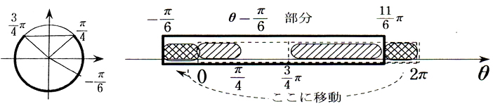 との関係が理解できない。そこで,単位円の部分を数直線の帯を使い,基本の答えである