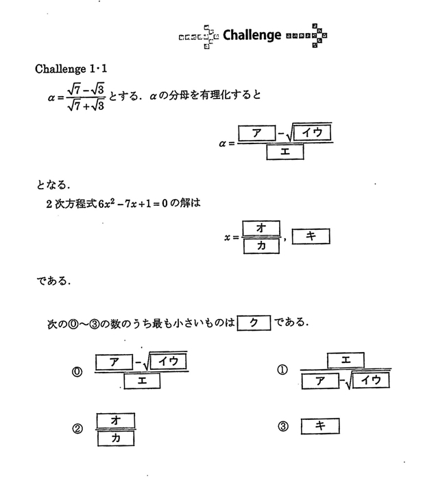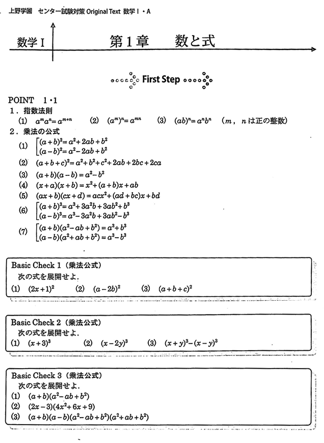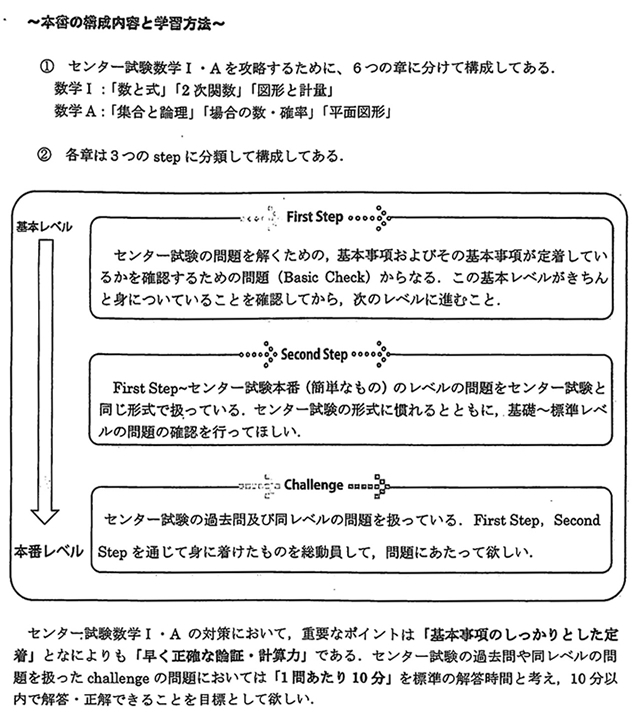 一般受験において,フォーカスシリーズが定着した頃,センター試験に十分対応できる力をつけるため,新たな教材を探していたときに某予備校講師と問題集,参考書の話で盛り上がり,私が教えている生徒に最も適した教材を自ら作ってみようと思い,学校独自のオリジナルセンター試験対策問題集を予備校講師の協力のもと,作り上げ,まずは数学Ⅰ・Aの内容より手がけることになりました。内容は3つのSTEPに分けSTEP1では基本公式の再確認,STEP2ではセンター過去問の小問題をあげ,STEP3ではchallengeとして大問題を載せてSTEP1・2で学んだ内容の応用として生徒に解かせました。項目は大きく6章に分け,数と式から平面図形まで順に進むように作り,生徒は1年終了から2年の春休みに初めてこの教材を渡され,休み中に一度終える事を毎年行うことが恒例になり,この時期に行った数学の範囲は模試などの偏差値結果にも表れ,定着するようになり,この教材を使い勉強を行った生徒がセンター試験を受け平均点がアップしてきたことをみて,この問題集を作ることに間違いはなかったと確信しました。ただこれからセンターの内容も変わりつつあり,新たな教材作りを考え,生徒の得点アップをこれからも考えていきたいものです。