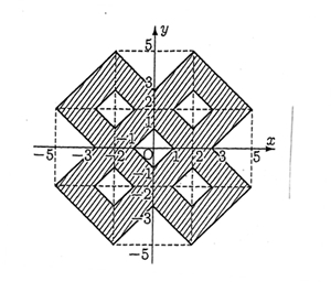 (例題3)不等式 1 ≦ || x | -2 | + || y | -2 | ≦ 3の表す領域をxy平面上に図示せよ。