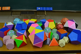 正多面体などの空間図形は生徒にとってイメージすることが難しい。そこで折り紙を用いて実際に正多面体を作製し,オイラーの多面体定理を確認することとした。合わせて半正多面体についても紹介したうえで展開図から半正多面体を作製し,オイラーの多面体定理を確認させた。写真は生徒が作製した多面体・半正多面体である。