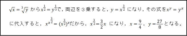 生徒は「この方法だと x=1,y=1 が出てこないことになり,何がまずいか分からない」と言ってくれ,「たぶん,指数を取り出すところが怪しい」と感想を述べた。生徒が予想した通りであり,命題「a p=aq → p=q」の真偽を問うたところ,多くの生徒は気が付いたようであった。a=1のときを考えれば偽になることが分かり,この点を注意すれば