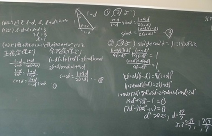 生徒S1は条件 (B) から等差数列であるので,3辺の長さをl-d,l,l+dとおいて説明をしている。条件 (C) によりl=1はすぐに分かり,その後は正弦定理や余弦定理を用いてdを求めている。テキストの解答例においては,3辺の長さを短い方からa,b,cとおいて説明をしているが,立式した後の計算においては3辺の長さについて対称性を利用した生徒S1の解法の方が本問題においては有用であると考えられた。授業後に生徒S1にインタビューしたところ,「最初は解答例と同様に3辺の長さをa,b,cとおいて計算を進めていたが,途中に出てくる4次方程式がどうしても解けなかったので,別のアプローチを考えた」とのことだった。このことから問題①に取り組む上で様々な解法を考えようとしている姿勢がうかがえた。