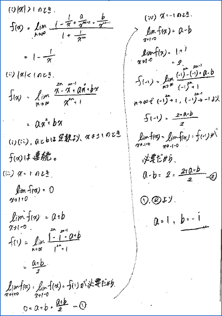 この解答は,テキストの略解にヒントとして提示されている方法と同じものであり,担当した生徒に確認したところ,略解を参考にしながら解答を作り上げたとのことだった。事前に筆者もこの問題を解いていて,担当した生徒の解答の確認をした後,筆者がこの問題を解いた感想について「