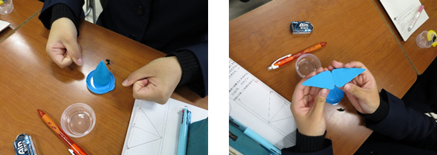 生徒は「粘土」を活用することに非常に積極的であった。幼少の頃を思い出したようにかなり熱心に立体をつくり,切断をしていた。切断する道具にミシン糸や針金,ナイフなどいろいろ試したが,細い釣り糸が比較的に切断しやすかった。