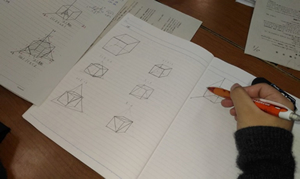 空間把握でいままで指導者側から切断面をイメージしやすい模型や図,スライドを準備してきたが,実際に切断させてみたことは今回が初めての試みであった。切断の際に少し立体が崩れることがあるが,予想以上に生徒の興味関心が高まり,頭に描いたイメージを求めて積極的に切断していた。今回の授業後も空間把握問題にであうと,「粘土で試したい」いう生徒が増えてきた。また,空間把握問題のイメージをノートに描くことができる生徒が増え,また描く図形も以前に比べ美しくなった。