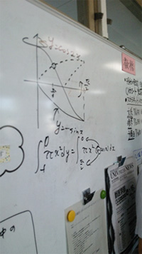 先述のとおり,非常に端的に言えば「生徒が頭を動かしていればAL型授業といってよい」というとても緩い共通認識のおかげで,職員がそれぞれのスタイルでAL型授業を実践していることが本校の大きな特徴である。数学のAL型授業において学習の主体が「グループ主体」「ペア主体」「(クラス全体に質問を投げかけて指名する)個が主体」の大きく3通りに分けられるが,本校では担当者それぞれのスタイルに合わせてすべての形の授業が実践されている。「担当者に断りなく授業を見に行ってよい(すべての授業が公開対象)」というルールもあるので,研究授業のみならず授業互見が積極的に行われているが,その際も授業の型ではなく教材研究に話が割かれることが多い。本校の職員室は学年ごとの座席になっているが,同じ教科の職員が近くに配置されることから,職員室の中でも教科の話になることがよくある。学年の白板にもこのような数学の落書きがかかれることがよくある。