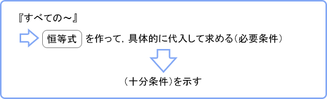1点目は本質的な理解できていないと,恒等式に気づかず,何をしていいか分からない生徒が多い。2点目は恒等式だから,具体的な数値を代入して,答えを導いて終わっている解答も多い。十分性の議論がない。