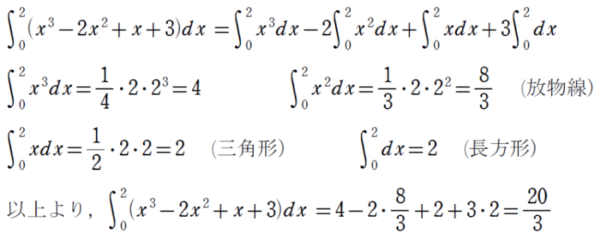3次以上の整関数であれば原始関数を求めて定積分する事が普通と思われるが,三角形や長方形の面積であれば図形的に計算したほうが早い。