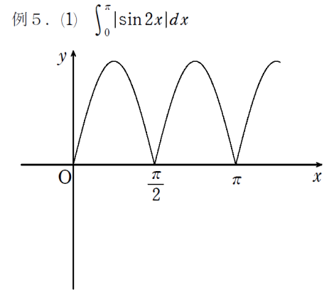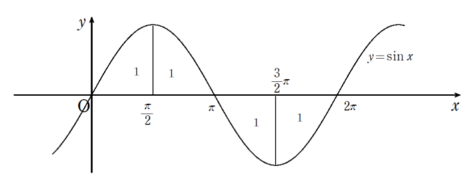 関数 y = sin x のグラフとx軸で囲まれる部分の面積はひとつ2である。またx軸との交点で点対称,隣り合う交点を結ぶ線分の垂直2等分線に対称である。