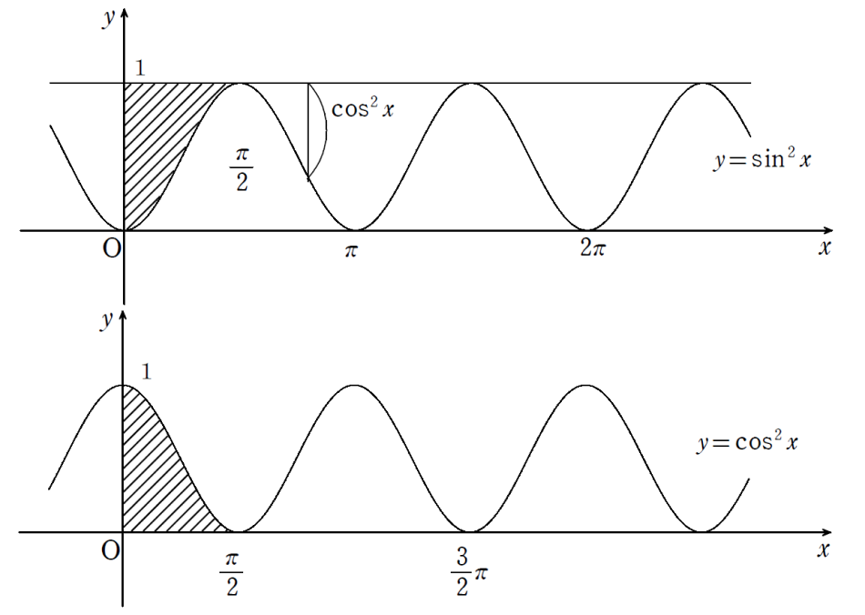 さらに,相互関係 sin2 x + cos2 x = 1 から図の斜線部は合同である。よって, y = sin2 x のグラフのひと山の面積が