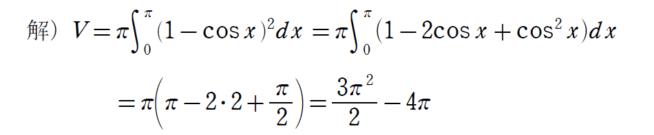 において,曲線 y = cos x と直線 y = 1 で囲まれた図形を,直線 y = 1 のまわりに1回転してできる立体の体積を求めよ。