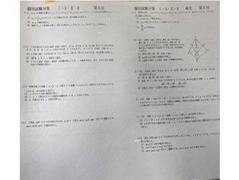 A4横用紙の左に授業で扱う問題,右にそれに関連する補充問題をまとめたプリント冊子を生徒に配布し,授業問題を切り取ってノートに貼って解答を作成。生徒は授業前に予習した問題を板書し授業で説明・討論。議論が一段落したところで,自分が解説。自分が作成した解答・別解・解説プリントを配布。