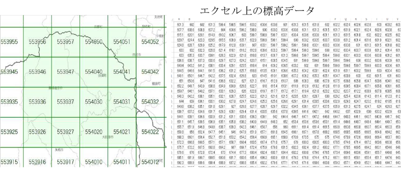 以前の研究では,まず,図2にある16区画の標高のデータを国土地理院のHPからダウンロードした。それらは,1350万個からなる標高のメッシュデータであり,エクセル上で操作できる。