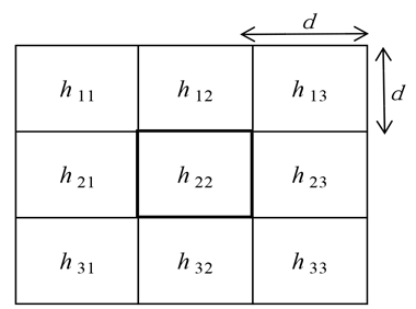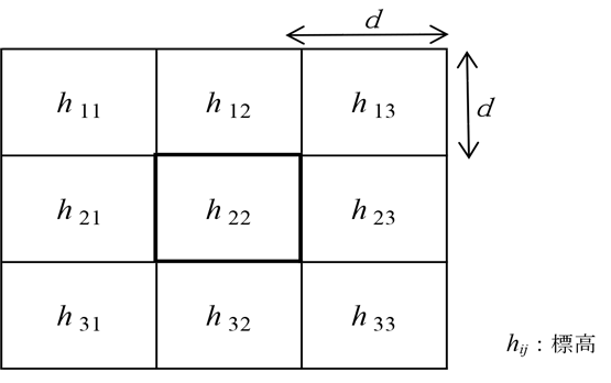 また前回では,山の斜面がどちらの方向を向いているかを計算するために,各地点で,次のような計算を行い,方角を決めている。まず,標高が次のように