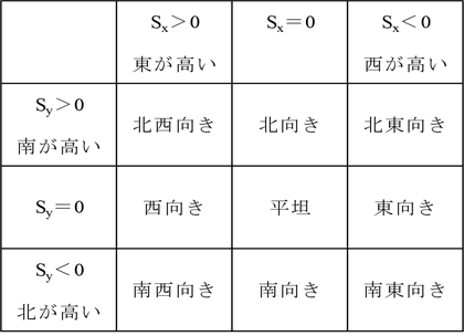 これらを組み合わせると,図7のように9種類に分けることができる。東が高いということは西向きであり,北と東が高いということは南西向きであることを意味する。