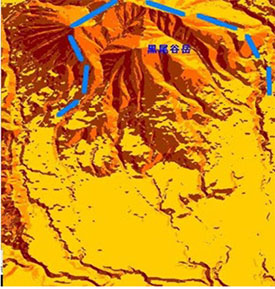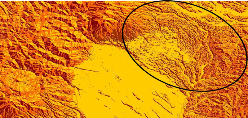 今回の分析の中心は,図の丸に囲まれたところで,明らかに過去に何かが起こり,地形が複雑になっているのがわかる。生徒もここを注視し,研究対象の中心にしたわけである。
