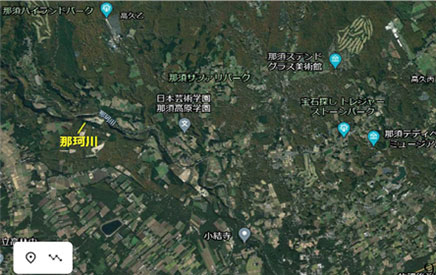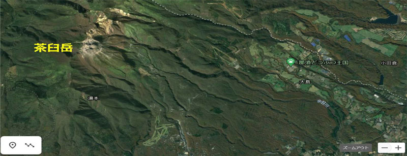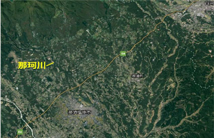 写真で見る限り人工物が多いせいか,なだれの跡は感じられない。ただ,図10は上空36000mからのものであるが,那須塩原市の市街地を境に,上の部分は緑が多くなるだけでなく,上から下に向かって緑の流れが感じられる。図の「E4」と書かれた黄色い線は東北自動車道である。