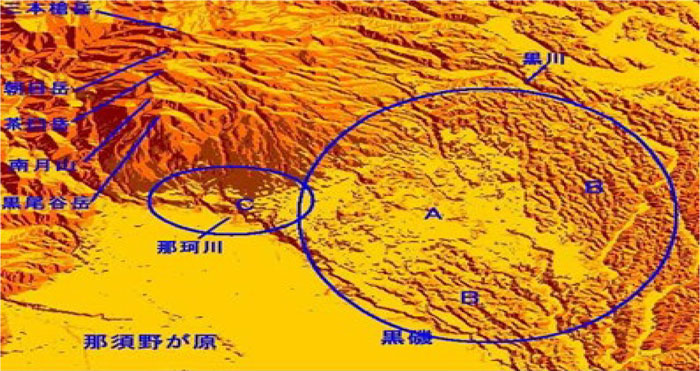 さて,話をなだれの跡A,B,Cの分析に戻し,文献からこのなだれについて歴史的にみることにする。A,B,Cには名前がある。A「御富士山岩屑なだれ」,Bは「黒磯岩屑なだれ」,Cは「那珂川岩屑なだれ」とよばれる(図41)。