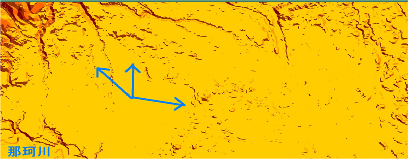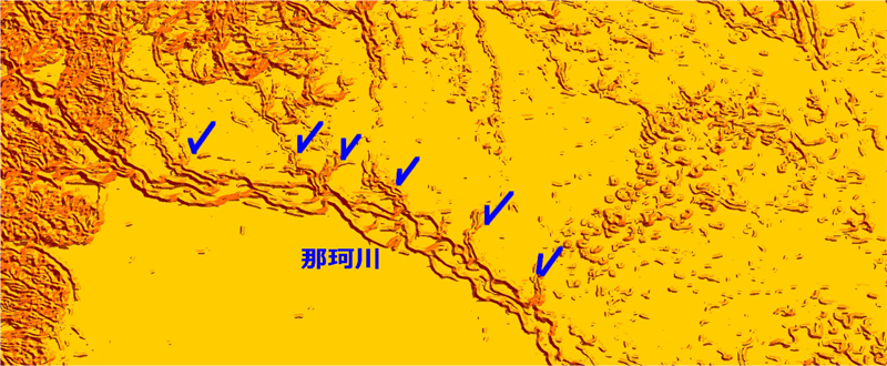 また,那須の山々の地形が東に開かれており,大部分東側に流れたと考えられる。仮に西側にある那須野が原にはなだれが入ろうとしても,那珂川がある。ここで川の水と混じり合い,泥流となって下流まで流れた可能性もある。図39の矢印のところでは,なだれが那珂川に流れ込んでいるように見える。那珂川はこれまで河岸段丘を起こしていて複雑な地形になっているが,それに加え,こうしたなだれの影響もあって,地形がさらに複雑なものになっていると思われる。箒川や蛇尾川にはこうした複雑な地形は見当たらない。