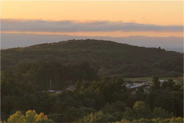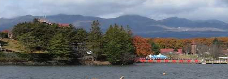 一番下の矢印が示す場所は現在のりんどう湖や,ホテルエピナール那須がある付近である。確かにこのあたりには小さな丘が多数ある。この辺で一番高い山は「御富士山」(おふじさん)とよばれ,「ロイヤルホテル那須」と「25那須ゴルフガーデン」の間に位置し,標高は497mである(図19)。地理学ではこうしてなだれが止まって形成された丘のことを,「流山」という。りんどう湖は人造湖であるが,この流山を利用することでできた。この丘の上に売店とレストランがある(図20)。