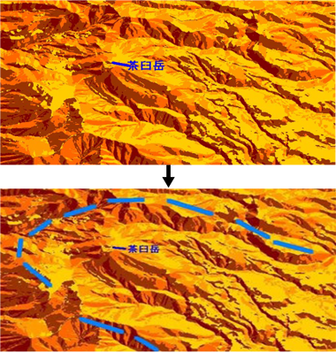 茶臼岳付近の14000mからの上空写真は図11のようになる。茶臼岳や朝日岳の方から幾筋かの流れの筋が感じられ,しかも山麓に行くほど,それらの筋が広がっているのがわかる。人工物が少ない写真からは,こうした痕跡も見て取ることができる。いずれにしても,なだれは那須の山肌を南東方向に向かって起こっているように見える。
