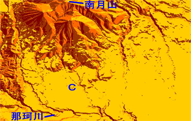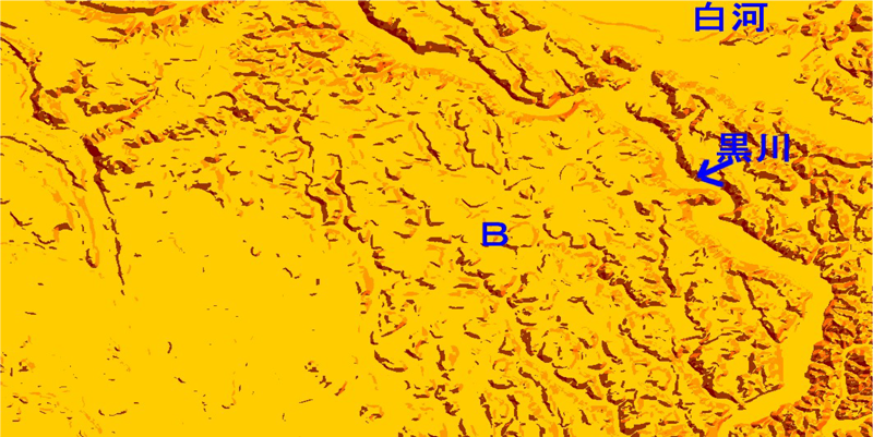 下の図12は図8を拡大したものである。この地区の地形は北西から南東に向けて多くの地形の“流れ”を見ることができる。そして,その上に,“粉”が降り積もったようなところも見られる。まずA,B,Cあたりに地形の流れ跡が見られる。(Cの部分はわかりにくいが,この後の図でわかりやすく示される)この地域は那須山が間近であり,文献資料によれば大昔,火山活動が活発であった。三本槍岳から南月山にかけて,噴火が繰り返されたところである。容易にこの地区が,噴火による溶岩や岩屑(がんせつ)(溶岩よりも低温)のなだれの流れた跡ではないかという推測がつく。しかも,BよりもAの方が新しく,元々Bの流れによってできた地形のところに,Aが重なってできた地形だと推測できる。