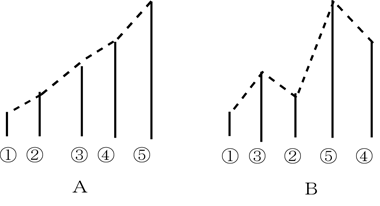 こうした那須の地形の特質をさらにはっきり見るために,標高データに新たな数学的処理を加える。前述したようにいくつかの標高の標準偏差を計算すると,それはその地点のでこぼこ度を表す。しかし,図26でAの①②③④⑤を①③②⑤④に並べ変えたものがBであるが,AとBのどちらも標高の値は同じなので標準偏差は同じになる。しかし明らかにBの方がでこぼこがあると考えられる。つまり,標準偏差だけではAとBの差を見分けることができない。