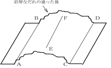 茶臼,南月山,三本槍岳のところにはかつて成層火山(富士山型の火山)があり(点線で示された山),それらが噴火でくずれ,茶臼と南月山のところにはカルデラができた。その際流れ出た岩屑なだれがA,B,Cの跡を形成しているものと思われる。