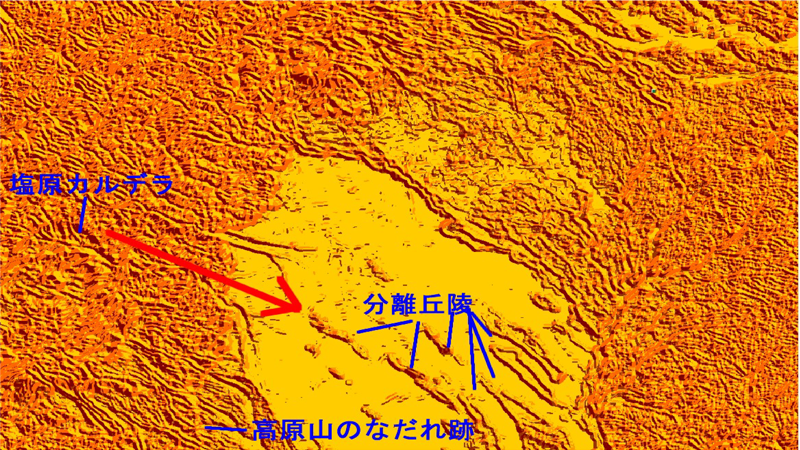 茶臼カルデラのところに最初に出来たのは1万~2600年前で「溶岩流原」ができた。溶岩流原とは,火山の噴火に伴って,地下のマグマが液体の溶岩として地表に噴出し,流下しその結果,地表に残された地形のことである。