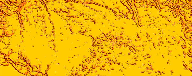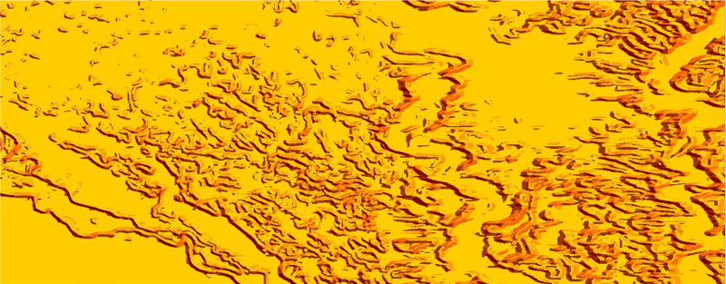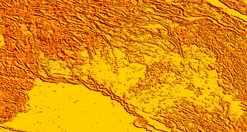 エクセルで標高に応じてセルに色をつけ,セル幅や行幅を1ピクセルまで縮めると,図3のように山地や平野が現れる。