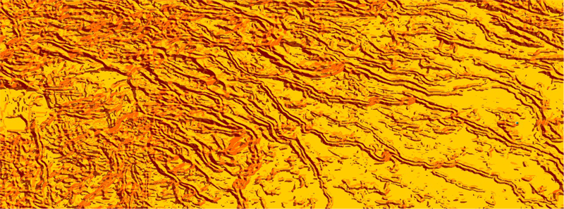 なだらかな山の斜面と,標高があまりなくても溶岩が流れたでこぼこの多い所は同じ標準偏差の値をとってしまう可能性がある。そこで試みとして,各地点における標準偏差の値ではなく,隣り合う地点どうしで,標準偏差の変化と方向に着目したいと思う。次のようにエクセルのセルに標高ではなく標準偏差