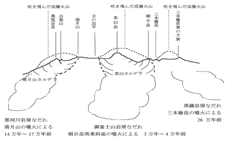 那須火山群は約60万年前から活動が始まり,まず初めに北側にある甲子旭岳(三本槍岳の北側で図にはない)が60万年前から噴火した。次はそのやや南側にある三本槍岳が40万年前から25万年前に噴火し,20万年前から5万年前までさらに南側の朝日岳と南月山が活動した。現在噴気活動をしている茶臼山は3万年前から活動している。