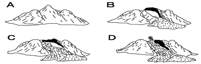 茶臼岳の形成は次のA,B,C,Dの順に進み形成された。