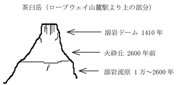 ちなみに茶臼のところにあった成層火山(古茶臼火山体)は標高2000mを超えていたと推測されている(現在の茶臼岳は1915m)。図40の茶臼岳と黒尾谷岳は,カルデラが出来てから二次的に出来た山である。このうち,今の茶臼岳の形成となだれを中心にその成り立ちを図で説明する(図42)。
