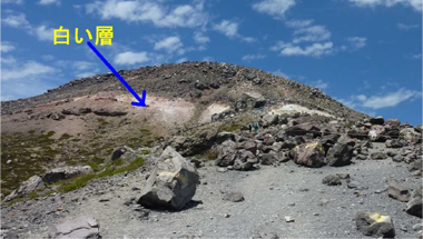 そして最後に1410年に溶岩ドームの形成がされた。溶岩ドームとは,火山から粘度の高い水飴状の溶岩が押し出されてできた,ほぼドーム状の地形である。溶岩ドームは図44の白い層より上の部分である。この白い層は1408年の噴火(水蒸気爆発)で降り積もった噴出物で,その上を頂上まで覆っているのが1410年の噴火で流出した安山岩溶岩である。この噴火で180人余りの死者が出た。