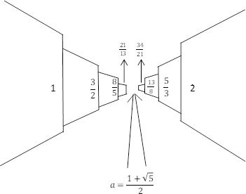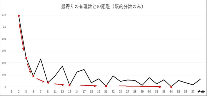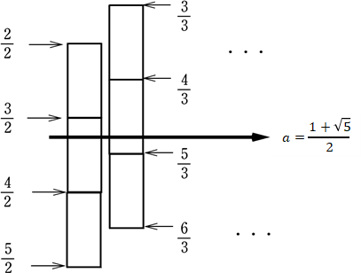 その意味で,黄金比はこの中で,有理数と一番距離を取っている無理数であることが裏付けられる。そして黄金比と一番近い距離にある有理数はフィボナッチから構成された分数である。