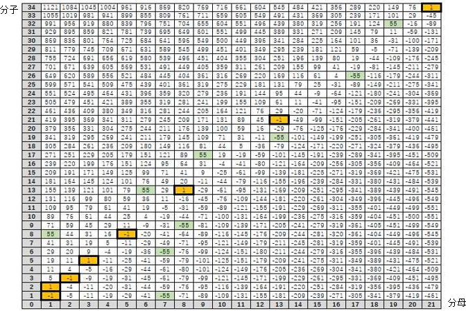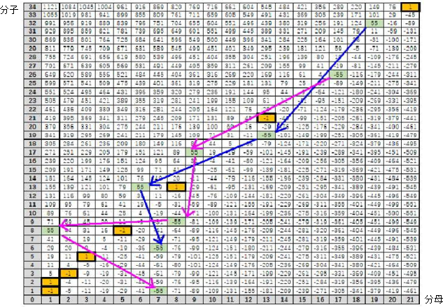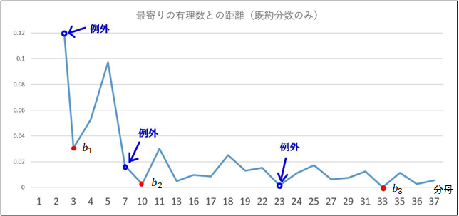 に出てこない分母が2と7と23のときも最小値が更新されることが確かめられる。