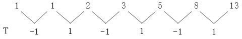 つまり隣接する項では,絶対値は同じで,マイナスをかけたものである。実際,フィボナッチの数列で最初から計算すると,
