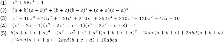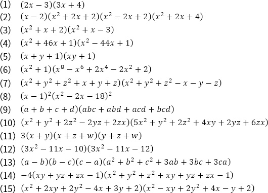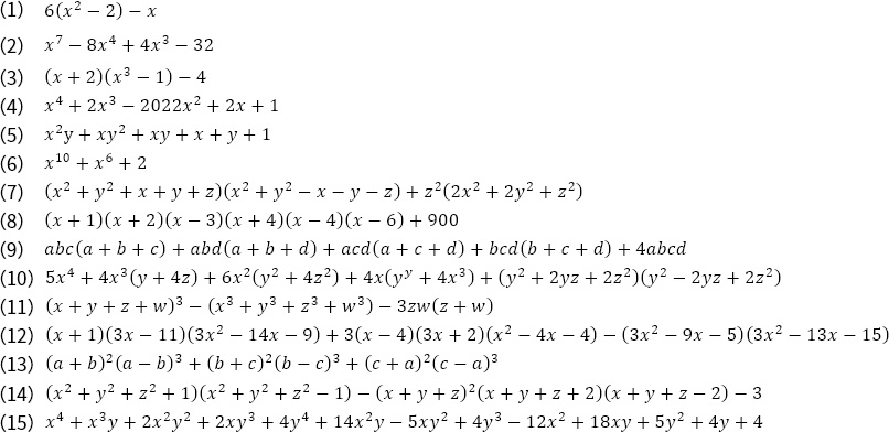研究テーマは各自自由であるが,研究資料として,大学初年レベルまでの興味ある問題(数学好き,数学が得意な生徒にはちょっと頑張ればわかってできるレベル)を扱っている「数学発想ゼミナール1・2(ローレン・C・ラーソン著,秋山仁訳)」や現在の自分の数学力レベルがわかる数学検定の過去問(準1級,2級,準2級(1次,2次))などが準備されていて,この中から研究テーマを選ぶことも可能である。また,徳高祭(文化祭)の恒例イベントになりつつある「徳山高校 因数分解コンクール」用の問題を作成するという活動をしている班員もいるので,本稿ではこの件について紹介したい。