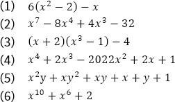 科学部数学班の顧問になってすぐにN君(3年次生)が,昨年度から文化祭で「因数分解コンクール」を始めたこと,今年も行いたいことを伝えに来た。まだ,4月初旬のことで気が早いと思ったが,熱意を持って因数分解の問題を考えていることは十分わかった。また,昨年度の問題は難易度が高く,余り解けなかったのでどうすればよいかという相談も受けた。かなりマニアックな問題も多く(15問),これを短時間(30分)で解ける生徒は少ないだろうという印象をもった。N君としては自分の考えた問題をしっかり多くの生徒に考えて欲しいという気持ちもあるのだろうが,難易度を下げた問題も何問か入れ,文化祭で参加する生徒が楽しめるようにしたらいいのではないかという助言をした。