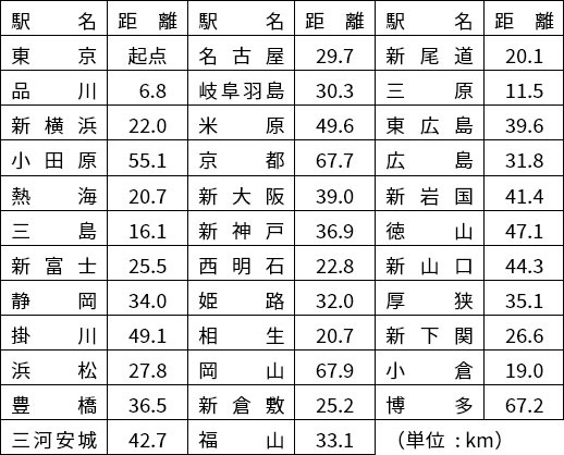 できあがったヒストグラムと正規分布曲線を比較し,「65km以上75km未満」の階級値が非常に多いと生徒は感じたようだ。具体的には「米原~京都」「相生~岡山」「小倉~博多」の3カ所であった。それらの共通点を考えると,「城」と「県庁所在地」の2点が挙がった。しかし,「城」は大小さまざまあり,現存するかしないかでも印象が違う。もう一方の「県庁所在地」について見ると,この路線上の県庁所在地は横浜,静岡,名古屋,京都,大阪,神戸,岡山,広島,山口,福岡の10都市であった。そうすると京都,岡山,博多だけを特別扱いする理由はないように思われた。しかし,もう少し調べてみると新富士,掛川,三河安城,新尾道,東広島の5駅は後から作られたものであることが分かった。つまり,以前はほとんどの県庁所在地付近の駅間の距離はもっと長かったが,その後,駅の追加により駅間の距離が短くなったことが分かった。