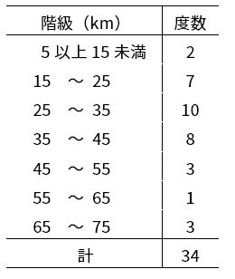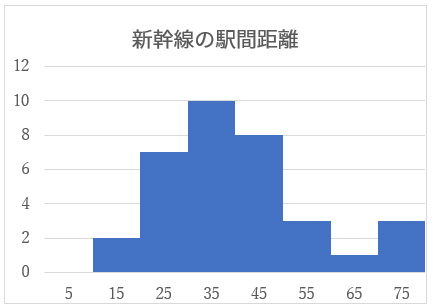上の表は東海道新幹線と山陽新幹線の各駅間の距離の一覧表である。表の中の「距離」とは前の駅とその駅との距離を表している。教科書では5kmから75kmまで10kmごとに階級を設定していた。そのときの度数分布表とヒストグラムが以下の通りとなる。