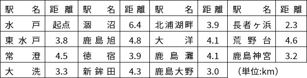 新幹線の例と同じで,表の中の「距離」は前の駅とその駅との距離を表している。この表に関して注釈を入れたい。まず最後の「鹿島神宮駅」はJR東日本の駅であり,大洗鹿島線の駅ではない。鹿島サッカースタジアム駅は鹿島サッカースタジアムで試合が行われるときのみの臨時駅であり,普段は閉鎖しているため,乗り入れの形で鹿島神宮駅が終点のようになっている。また表中の「長者ヶ浜」は略称で正式名称は「長者ヶ浜潮騒はまなす公園前駅」で,一時は日本一長い駅名だった駅である。