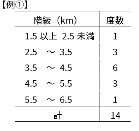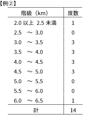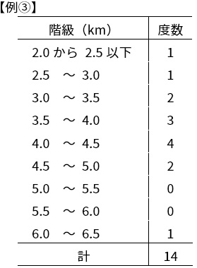 例③は例②とほぼ同じ度数分布表である。ただ,階級の切り方が例②では「〇〇以上から〇〇未満」を例③では「〇〇より大きいから〇〇以下」とした。これだけの差ではあるが,課題となりそうな点がありそうなヒストグラムを作ることができた。これ以外であれば,「階級の幅を変える」「階級の値を2.3以上2.8未満のようにする」などが考えられるが,例③は非常にすっきりとした形なので,公開授業では例③を採用した。